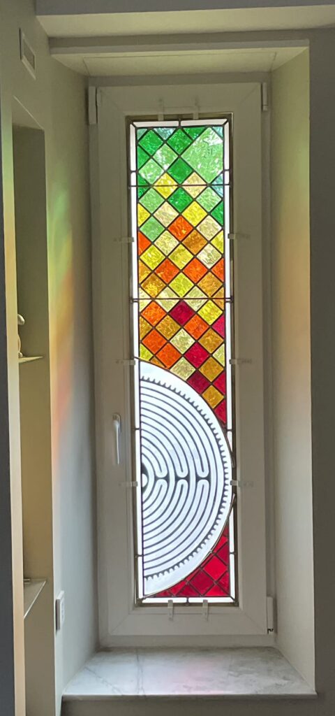 Ce vitrail a été entièrement réalisé avec des verres texturés waterglass de 3 mm et du verre float pour la demie rondelle, offrant un jeu de lumières et de transparences unique.
